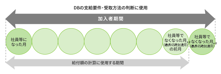 - DBには、社員等*1になった月に加入し、社員等でなくなった月(最長65歳到達月)*2に脱退します。